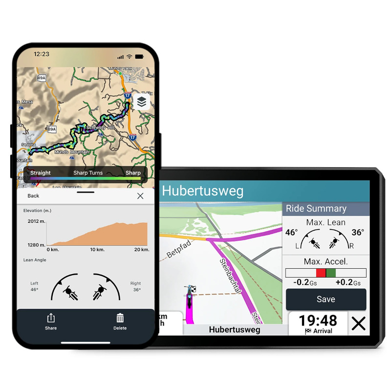 Wyświetlaj i udostępniaj m.in. kąt pochylenia, dane dotyczące przeciążenia oraz maksymalną prędkość w podsumowaniu jazdy za pomocą aplikacji Tread® na smartfon.
