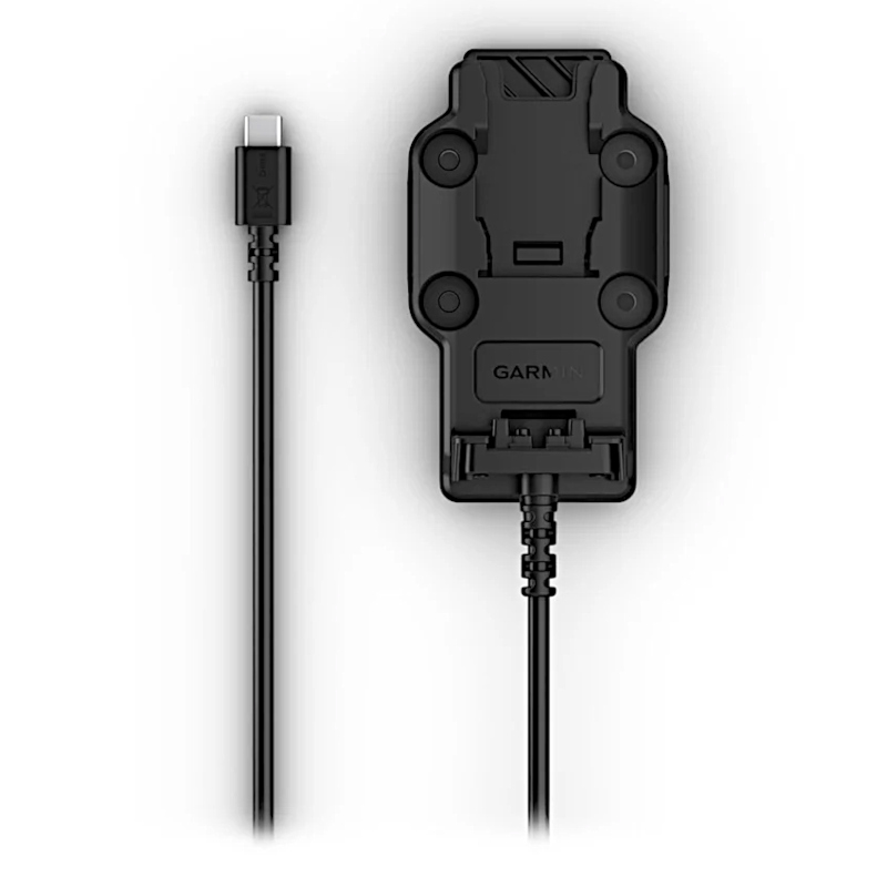 Oryginalny uchwyt umożliwiający mocowanie i zasilanie urządzenia Garmin na motocyklu, pojeździe terenowym (quad, skuter śnieżny), łodzi, samochodzie. Otwory w uchwycie umożliwiają integrację z systemem RAM (ramię/gniazdo kulowe AMPS sprzedawane jest osobno) Przewód zasilający wyposażony w zintegrowany przewód ze złączem USB-C.